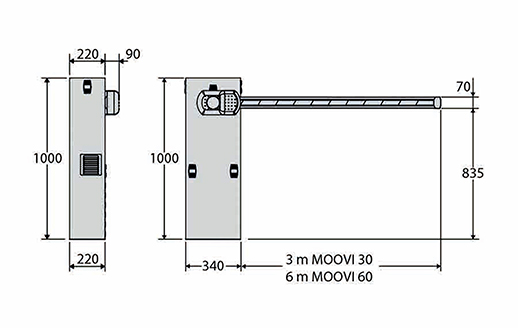 MOOVI 60 - Barrera electromecánica marca BFT modelo MOOVI 60. Disponible en 220v, paso útil de hasta 6m. Tiempo de apertura 8seg. Uso semi intensivo. Máximo 600 ciclos por día. Color gris. Tarjeta electrónica alpha bom. Llave de desbloqueo personalizada.