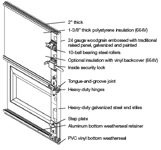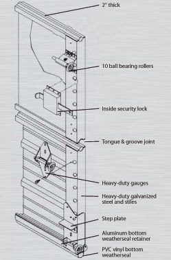Puerta de garaje industrial seccionada de una lámina en acero galvanizado, calibre 20, 24 y 25 de 2" de espesor, con acabado en pintura poliestérica, brindándole a la puerta fiabilidad y duración, cumpliendo con los rigores y exigencias del uso diario.